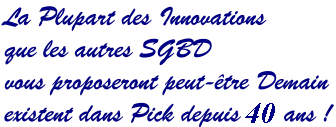 Aujourd'hui, ce concept s'est imposé. Mais pick était sans doute le premier et reste encore le seul à afficher une telle transparence, pour le développeur comme pour l'utilisateur. Pick est un s.g.b.d. qui simplifie le travail des développeurs comme des utilisateurs grâce à sa facilité de développement et sa simplicité d'utilisation.